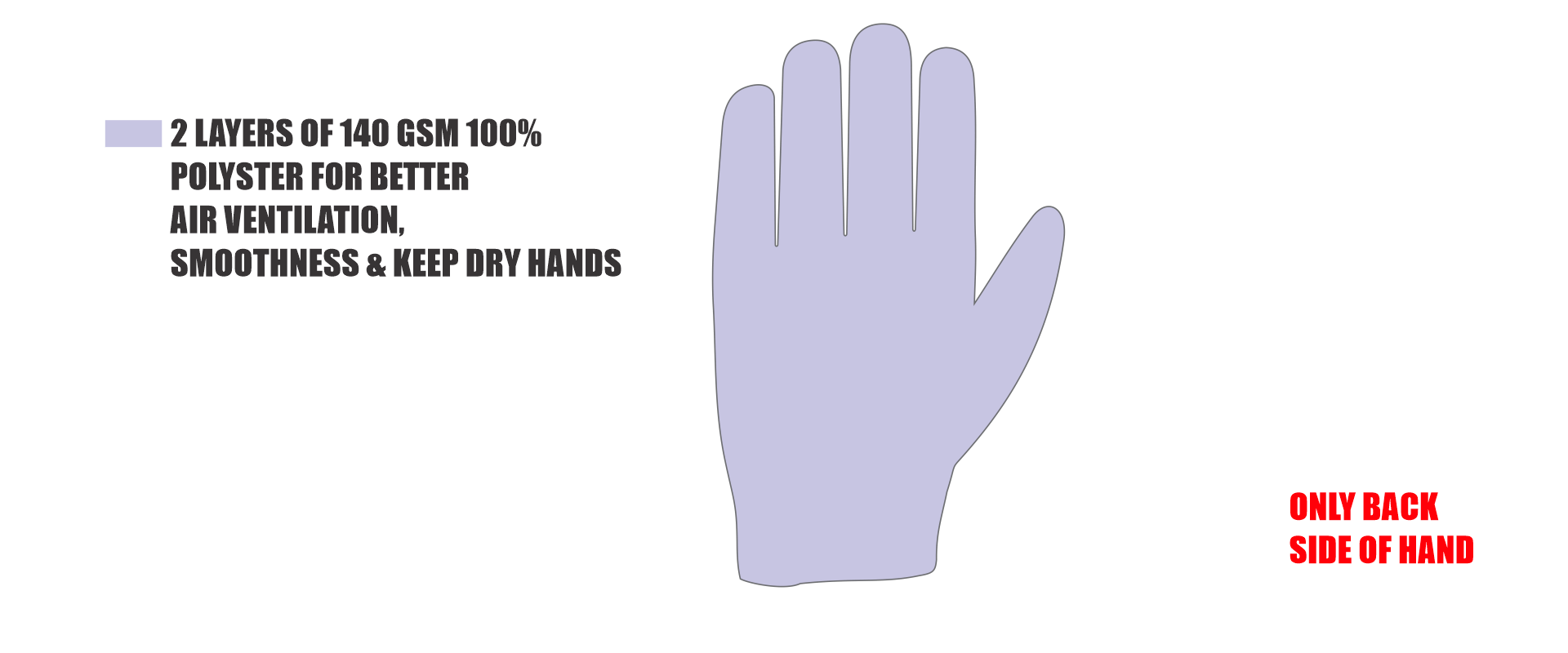 Two layers of 140 GSM 100% Polyester on the backside of the hand for optimal air ventilation,
