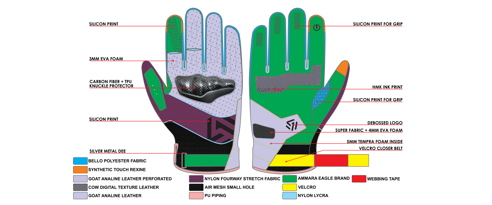 Strategically placed silicon print on the palms and fingers for superior grip in various conditions.