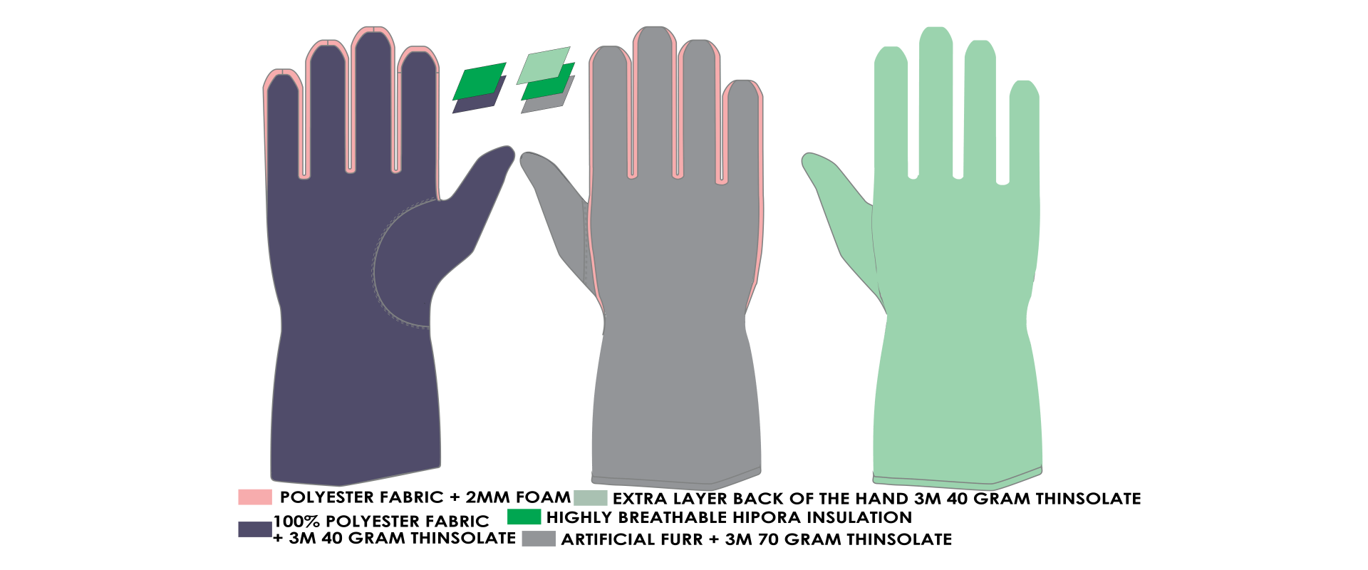 EXTRA LAYER ON THE BACK OF THE HAND FEATURES 3M 40-GRAM THINSULATE FOR ADDED INSULATION.